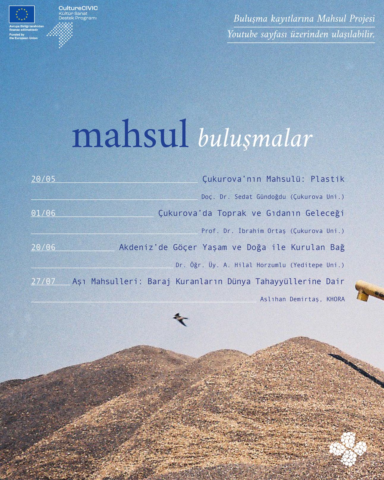 Çukurova’daki endüstriyel tarım pratiklerinin çevresel, kültürel ve toplumsal mahsullerine odaklanarak işe koyulan Mahsul projesi, 2021-2023 yılları arasında Çukurova’da saha araştırmaları, halka açık buluşmalar ve söyleşiler düzeledi. Bu yıldan itibaren ise BAYETAV (Bir Arada Yaşarız Eğitim ve Toplumsal Araştırmalar Vakfı) desteğiyle İzmir ve çevresinde tarımsal üretimin çevrede ve toplumsal hafızada bıraktığı izlere odaklanacak.