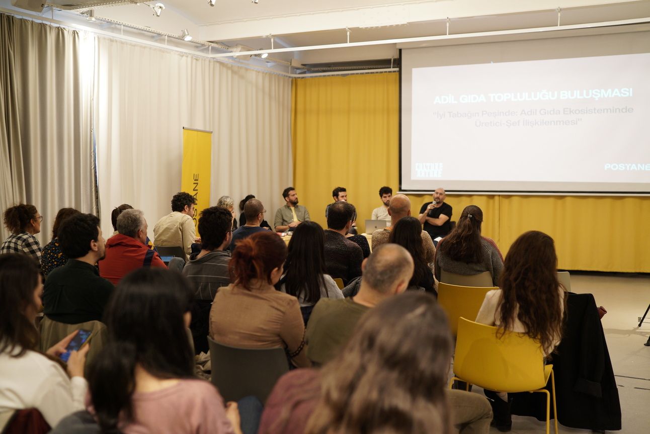 15 Mart 2024 Cuma günü Postane’de gerçekleşen buluşmada, adil gıda ekosistemi içerisindeki üreticilerle şeflerin işbirliğine dair ülkemizdeki öncü deneyimleri dinledik, şeflerin gıda adaletinde oynadığı kritik rol üzerine düşünüp konuştuk. Moderatörlüğünü Bediz Yılmaz’ın üstlendiği buluşmanın konuşmacıları gastronom Tangör Tan (MSA ve Özyeğin Üniversitesi), kent çiftçisi Beyhan Uzunçarşılı (Urban Garden), Türkiye’nin ilk yeşil Michelin yıldızı sahibi şefi Maksut Aşkar (Neolokal), Postane bünyesinde hayata geçirilen Gıda Adaleti Ekosistemi Haritası’nın emektarlarından Mert Balıkçı ve Postane gıda operasyonu direktörü Can Arıkan idi. Buluşmada üreticilerle restoranlar arasında sağlıklı ve uzun soluklu bir işbirliği kurulması için güzel öneriler dile getirildi, bu ilişkilenmenin sonraki adımlarına dair planlar yapıldı.